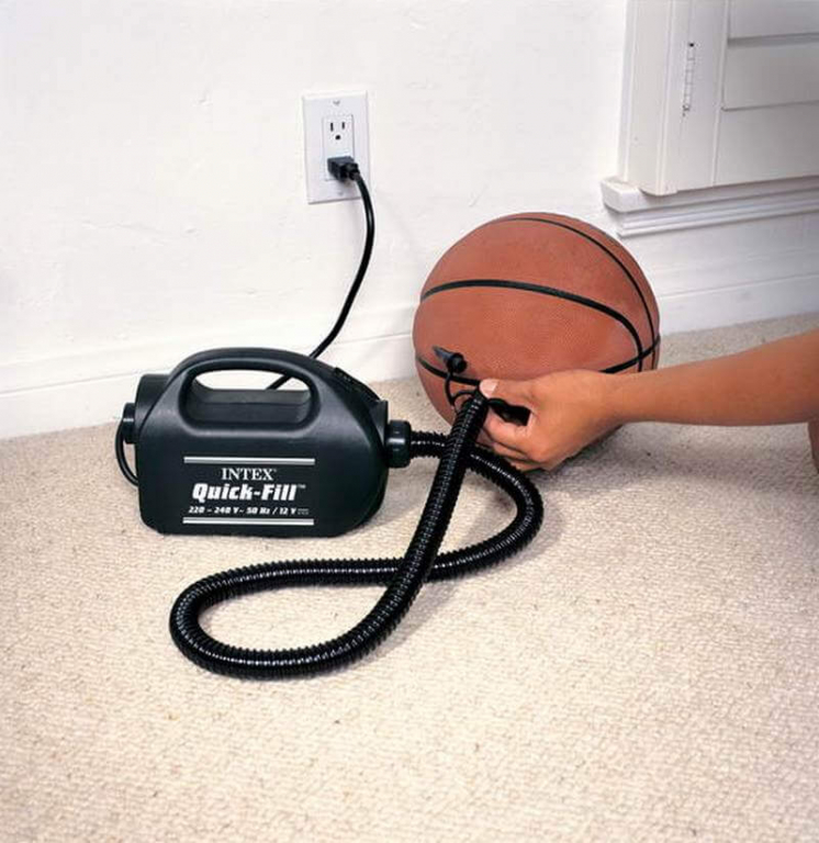 В комплекте с насосом идет провод к прикуривателю 12 В, адаптер на 220В, гибкий шланг и 4 универсальные насадки для всех видов надувных изделий и мячей. Насос подходит ко всем надувным изделиям Intex.